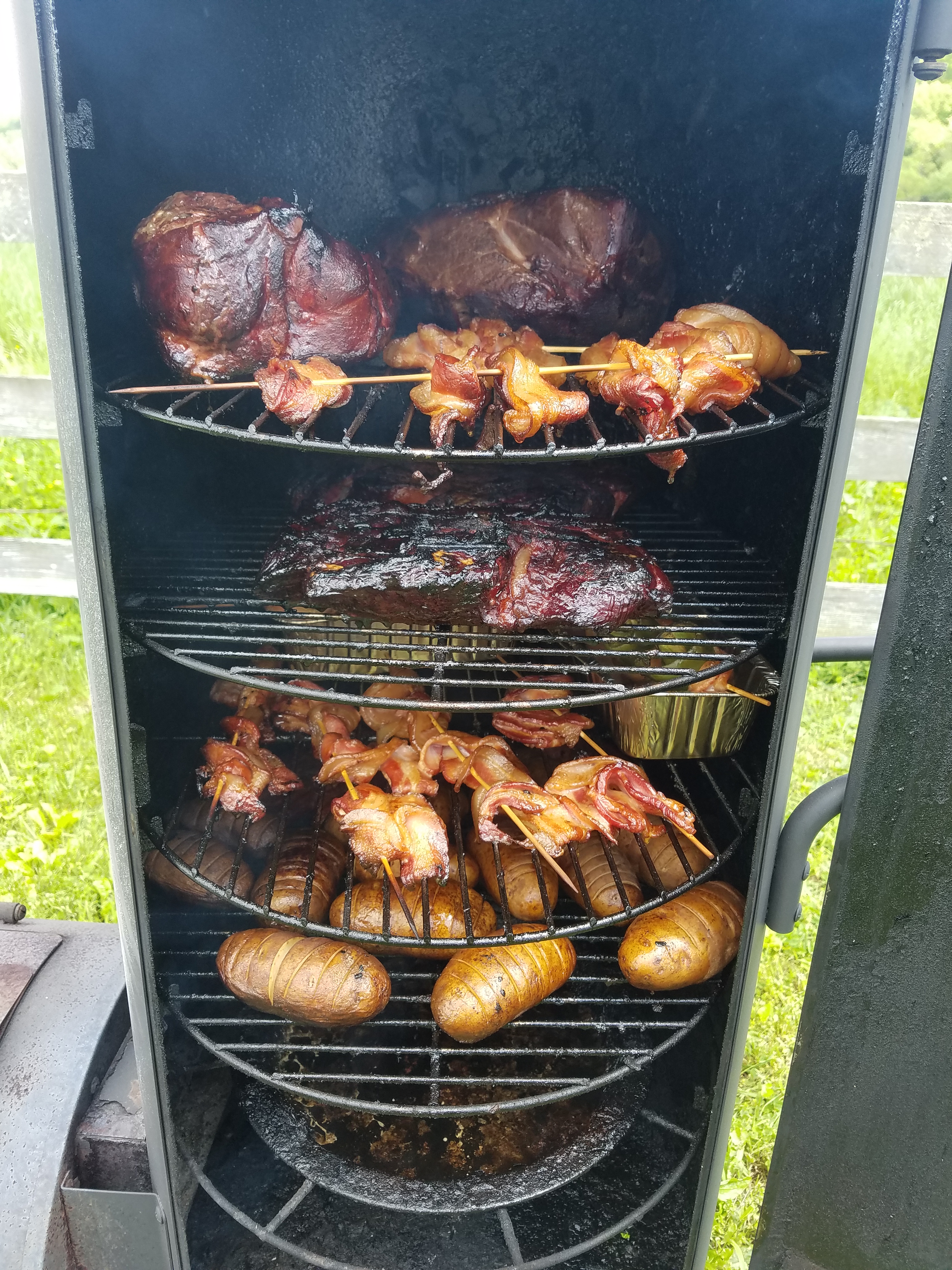 Here are pictures from the massive barbecue meal we had on Mother’s Day that I cooked. These pictures are imported from my other blog, Troy’s Thoughts on Sports. I smoked two pork shoulders, a sirloin pork roast, two chuck roasts, two whole cornish hens, 12 chicken thighs, 15 country pork ribs, about eight or nine skewers of thick cut bacon, 11 bacon wrapped cheddar cheese stuffed jalapenos, and about 17 potatoes.