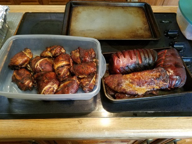 I smoked two racks of spareribs, two racks of baby back ribs, a 4.5 lb. pork shoulder, bologna, chicken thighs, mac and cheese, corn on the cob and cabbage.
