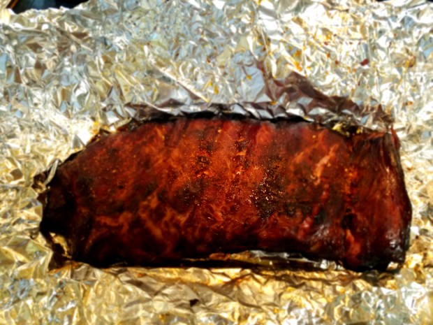 Uncle Yammy’s Memphis style chicken & rib seasoning was sprinkled liberally on all the racks of ribs except for one, which I used the KC Masterpiece habanero rub… dry rub that could have also doubled as a sauce if I would have mixed it with beer. I’m not much of a sauce guy, so I used it as a dry rub by default. It was OK… I’ll give it another shot. It tasted like the Lays barbecue potato chips, something I crave every now and again, and reminds me of summer school from my elementary school days.